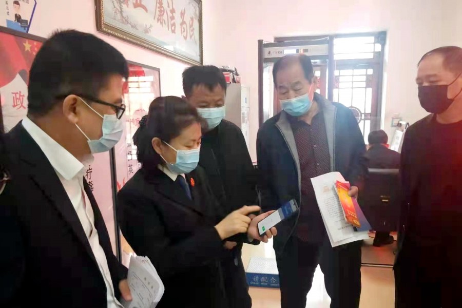 参会人员首先参观了法庭智能化审判系统、立案接待室、调解室、荣誉室,对法庭的工作有了进一步了解。随后,由法庭干警对移动微法院、跨域立案等诉讼平台的使用和操作向参观人员进行了演示和讲解。