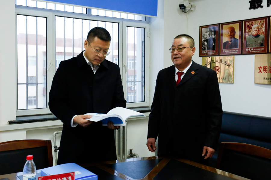 在勃利县人民法院中心人民法庭,曹茗一行就审判质效、多元解纷和“家事法庭”品牌建设等重点工作与一线干警进行交流,深入阐述党的二十届四中全会的重大意义和深刻内涵。在勃利县人民法院审判法庭、院史馆、党性教育基地等场所,曹茗详细了解勃利县人民法院“走在前列”工作、党建工作、“脱薄”工作进展等工作情况,并召开座谈会听取工作汇报。