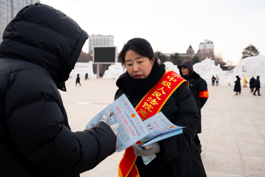 在冰上赛龙舟场外,法院干警设立的普法志愿服务点同样热闹,现场普法的干警结合自身专业优势,聚焦群众生活中的民事法律痛点难点开展宣传。针对冬季冰雪运动易发生的人身损害纠纷,详细解读侵权责任认定、赔偿标准等法律知识;同时就冰雪旅游中游客及商家的法律风险通过发放宣传手册、现场答疑解惑等方式,为群众提供专业的法律指引。
